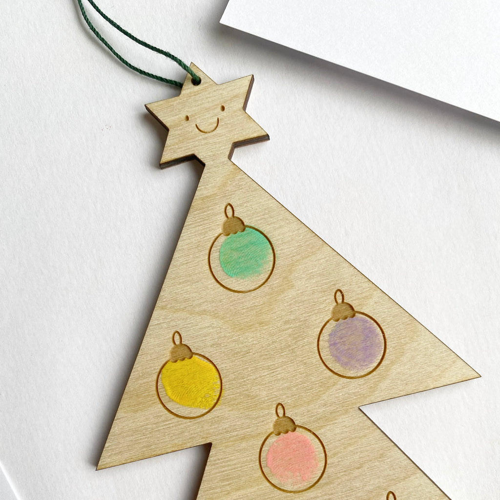 The kit includes a tree decoration and practise sheet ready to add your fingerprints.