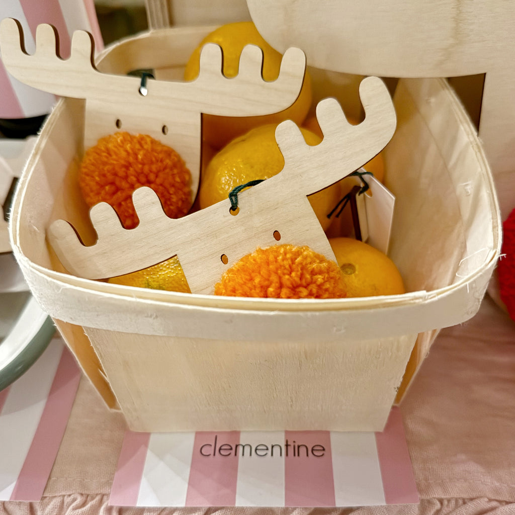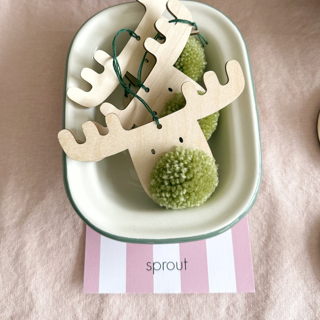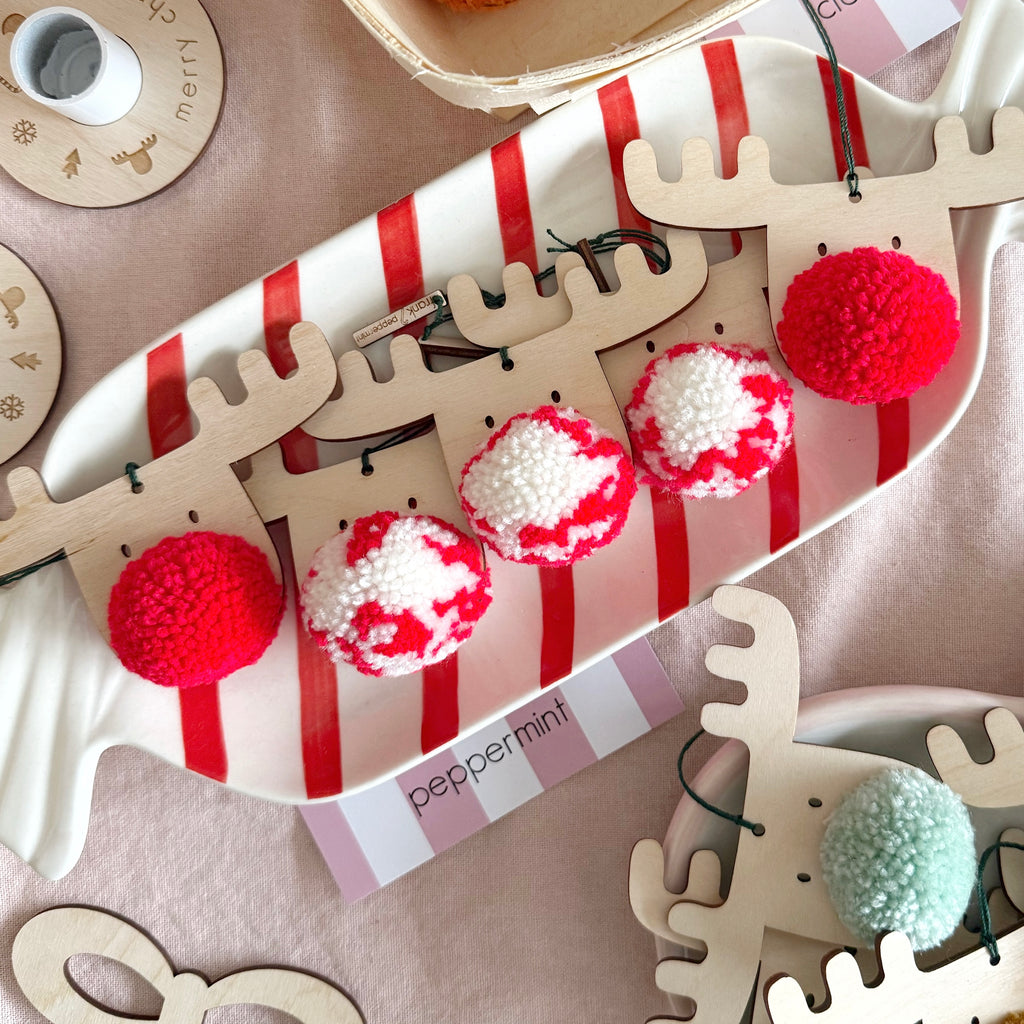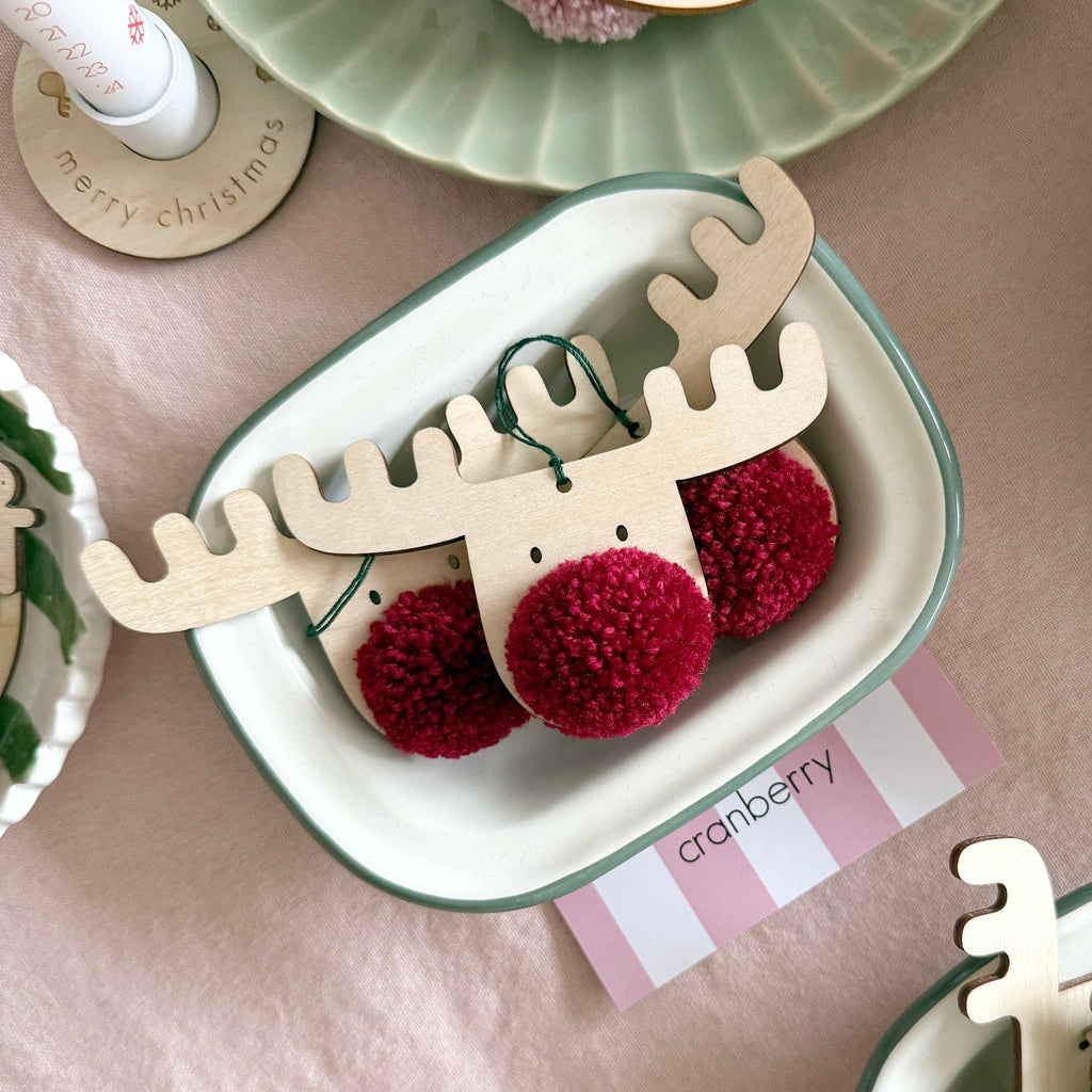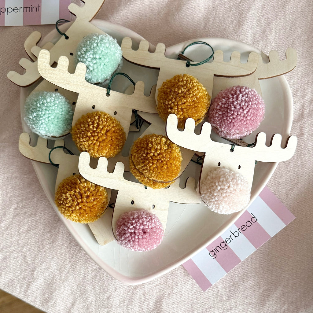 PomPom sizes vary and natural marks exist within the plywood surfaces on each decoration.